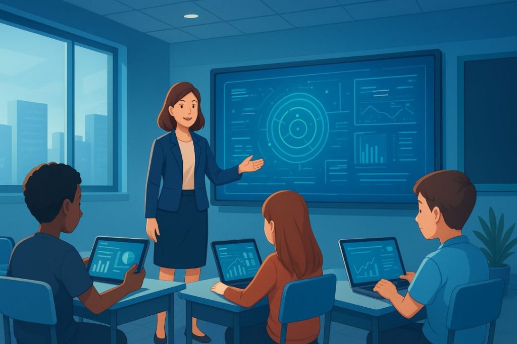Rekomendasi Thumbnail: Ilustrasi ruang kelas modern dengan guru dan siswa menggunakan perangkat digital.